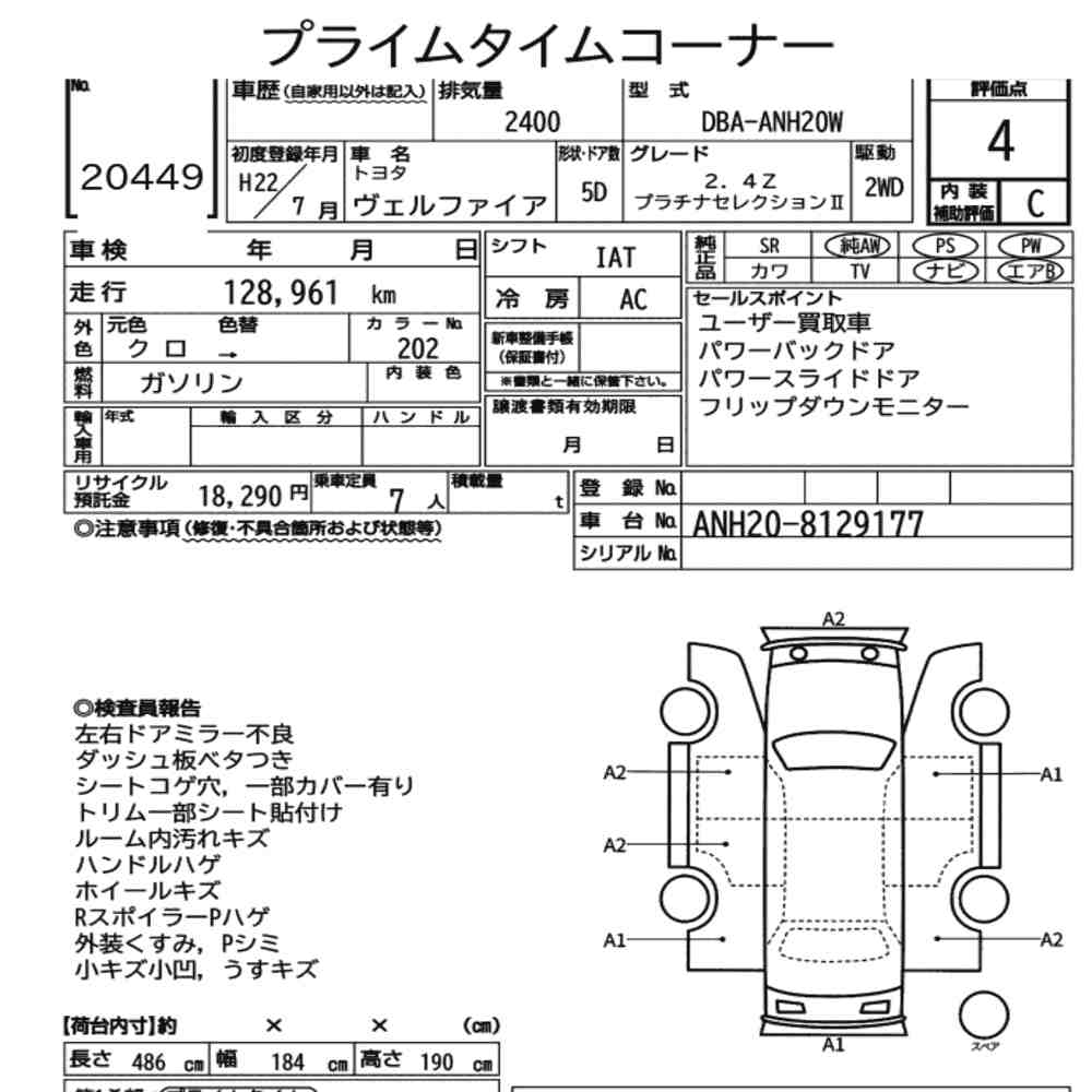 TOYOTA VELLFIRE 2.4 Z PLATINUM SELECTION, 7 SEATERS. AUCTION GRADE 4 COMES WITH, 7 SEATERS, TWIN POWER DOOR, POWER BOO. DROP DOWN MONITOR,WOODING STEERING, RYCLINE SEATS, SUEDE LEATHER SEATS,PARKING SENSOR, ALLOY RIMS,